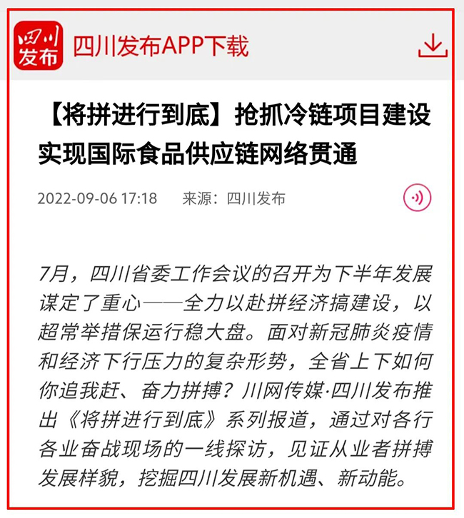 8月中旬,四川发布记者来到项目现场实地采访,感受快猫视频下载冷链一线建设者的拼搏热情和奋斗精神。9月6日,报道正式发布。